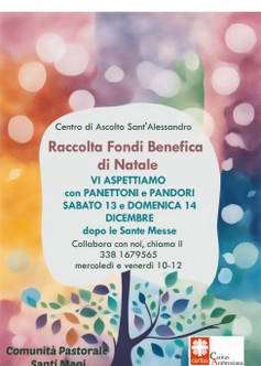 · E’ allestito il tradizionale banco vendita natalizio a sostegno del Centro d’Ascolto Caritas in Sant'Alessandro; indicazioni all'uscita