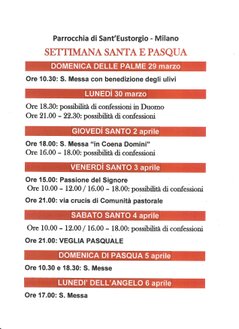 • E’ disponibile il calendario delle celebrazioni della Settimana santa nelle chiese della nostra Comunità pastorale e in particolare in Sant’Eustorgio con gli orari per le confessioni; volantino all’uscita.